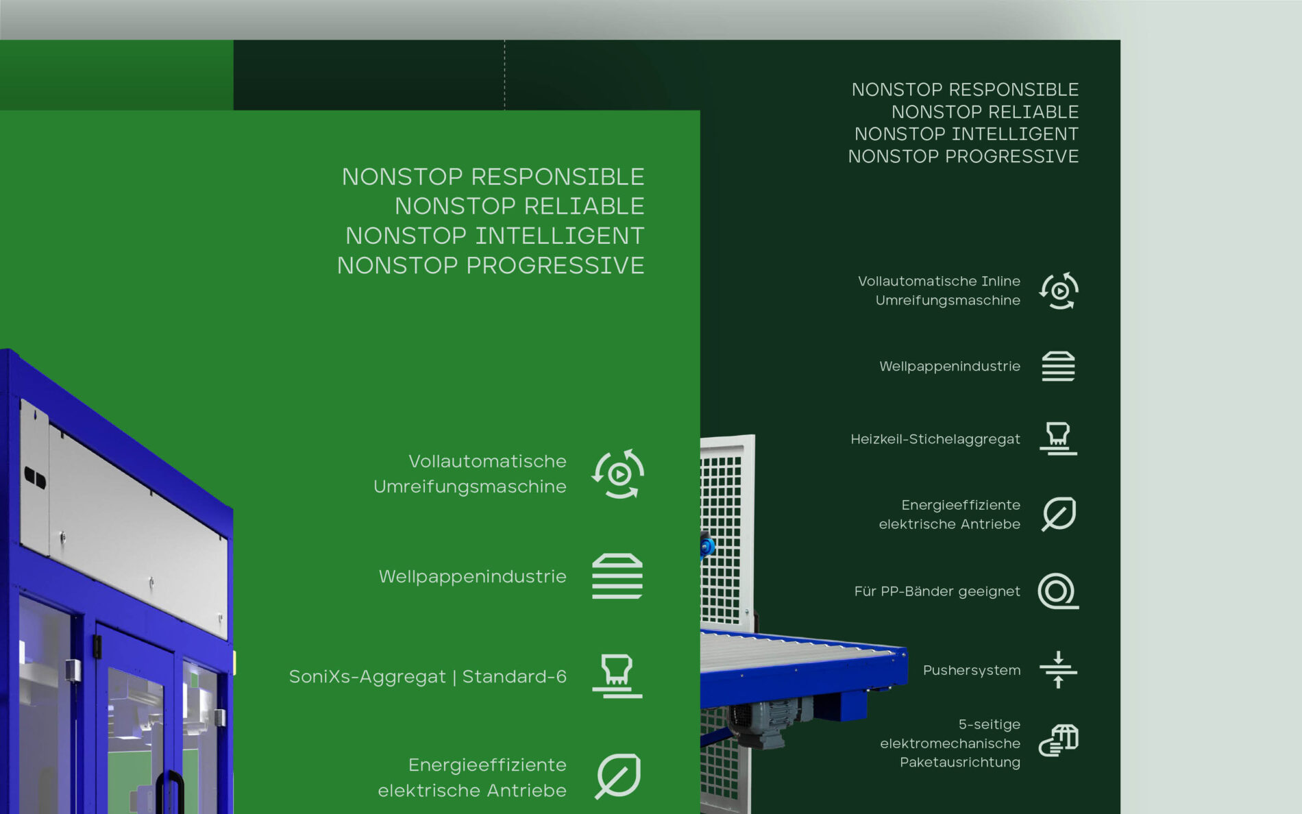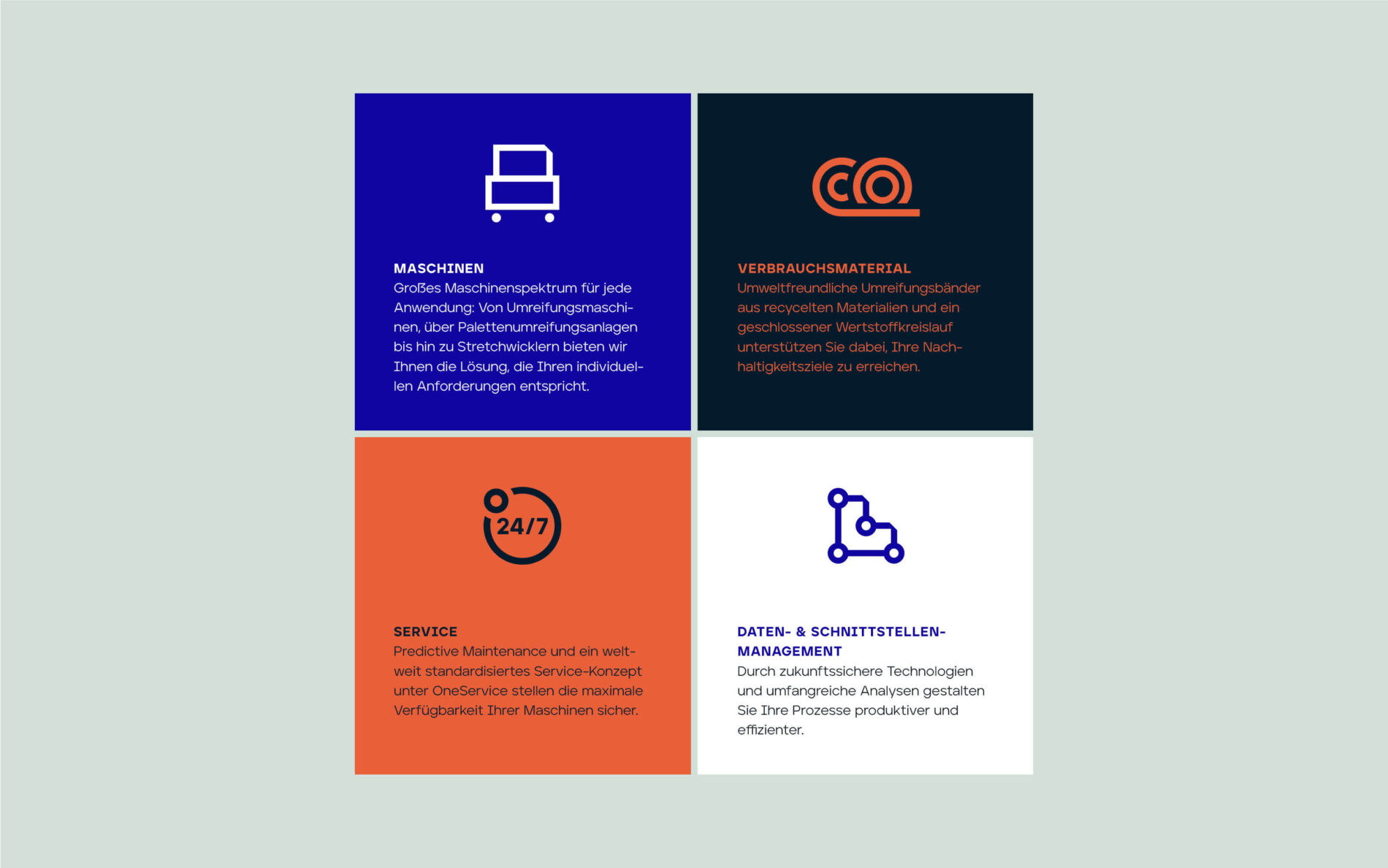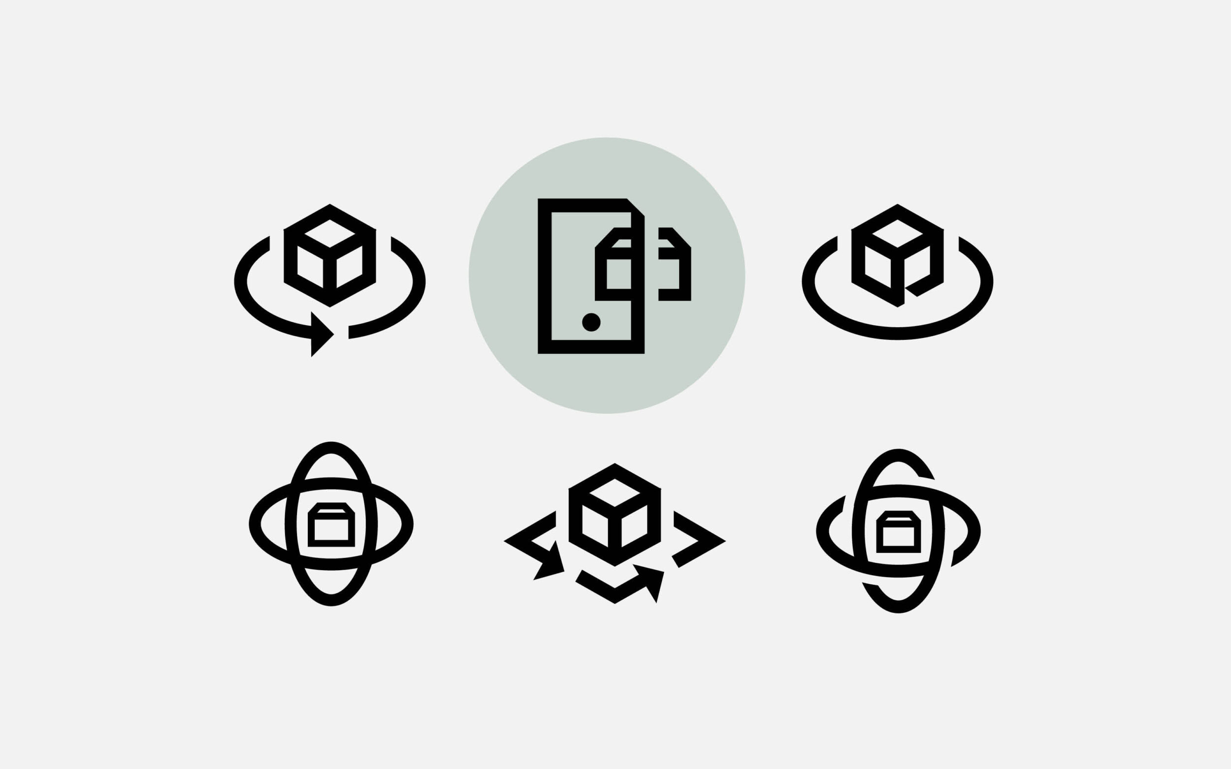 The Mosca house font inspired the design of the icons. While some were solved with a few drafts, others, like the icon for virtual showrooms, were more challenging to translate into a focussed visual language. Simplifying high-tech machines into recognisable and minimal icons was an exciting challenge for people outside Mosca’s specialist industry.